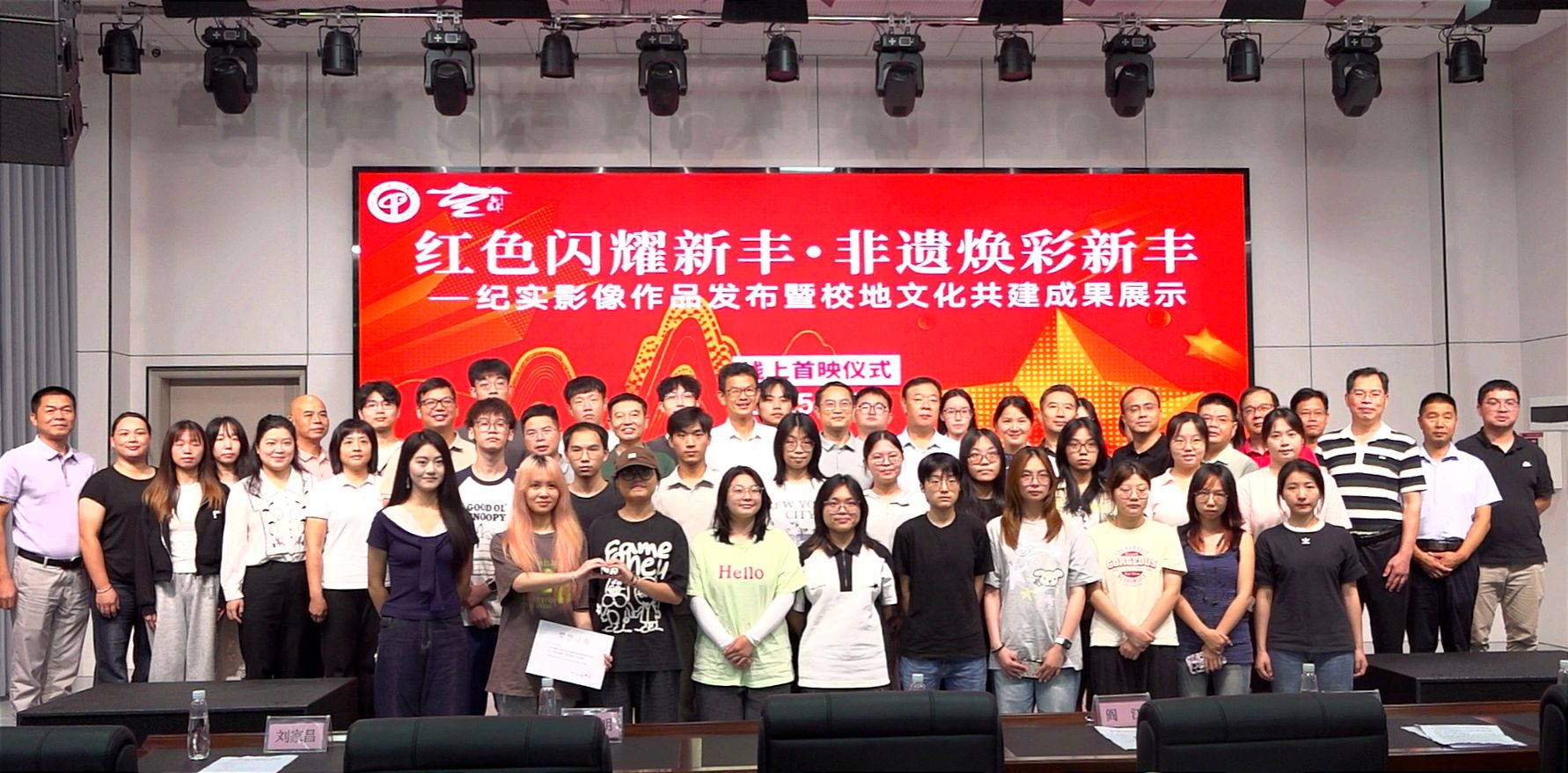 首映式现场揭晓优秀作品奖,《科罗红韵》《鹅醋钵》《茶香烽火路》《大席水路歌》等 12 部作品分获表彰,校地有关领导为获奖团队颁奖。