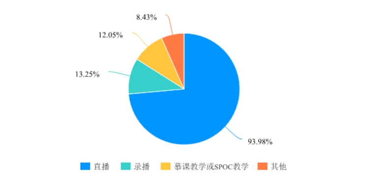 在调查问卷中,教学方式为直播的教师占93.98%;教学方式为录播的教师占13.25%;教学方式为慕课教学或SPOC教学的教师占12.05;教学方式为其他的教师占8.43%。