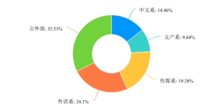 在调查问卷中,填写身份是中文系的教师占14.46%;填写身份是文产系的教师占9.64%;填写身份是传媒系的教师占19.28%;填写身份是外语系的教师占24.1%;填写身份是公外部的教师占32.53%。