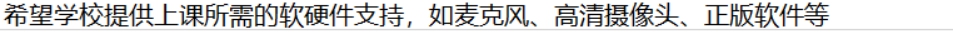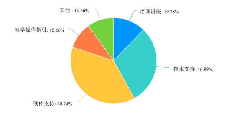 教师希望提供公司提供讲座培训的占19.28%;教师希望提供公司提供技术支持的占46.99%;教师希望提供公司提供硬件支持的占60.24%;教师希望提供公司提供教学操作指引的占15.66%;15.66%的教师希望公司提供其他支持,主要有:①课题申报;②维护系统稳定,减少故障;③希望公司提供一套应急备选方案指导意见:遇到不可抗力因素时,比如家中停电、断网,如何操作;④考试有关事情需要补充指导,出题/考试/打分等;⑤研究指导,精益求精;⑥尽快恢复线下教学。