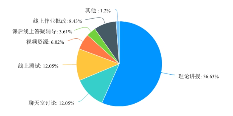 在课程环节中,教师认为理论讲授完成得最好的占56.63%;教师认为聊天室讨论完成得最好的占12.05%;教师认为线上测试完成得最好的占12.05%;教师认为视频资源完成得最好的占6.02%;教师认为课后线上答疑辅导完成得最好的占3.61%教师认为线上作业批改完成得最好的占8.43%;1.2%的教师认为直播互动环节完成的最好。