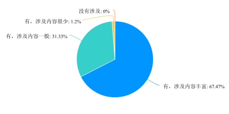 可见,超过一半以上的教师坚持了立德树人,进行课程思政,弘扬社会主义核心价值观教育,且涉及内容丰富;但仍有30%左右的教师涉及内容的丰富度有待提高。建议校方适当加强教师的思政教育,并提供相关的教学资源。