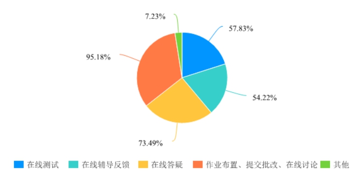在调查问卷中,选择在线测试为课程辅助方式的教师占57.83%;选择在线辅导反馈为课程辅助方式的教师占54.22%;选择在线答疑为课程辅助方式的教师占73.49%;选择作业布置、提交批改、在线讨论为课程辅助方式的教师占95.18%;选择其他课程辅助方式的教师占7.23%。