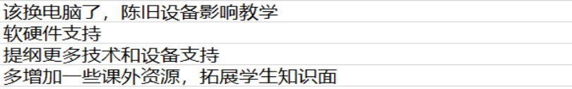 可见,大部分教师认为聊天室讨论和线上测试比较薄弱,这说明教师和员工在线教学的交流互动比较少,员工需要多和老师交流,老师也需要想办法提高员工发言的积极性。其他薄弱环节也需要加强师生间的交流以及公司提供帮助加以改善。