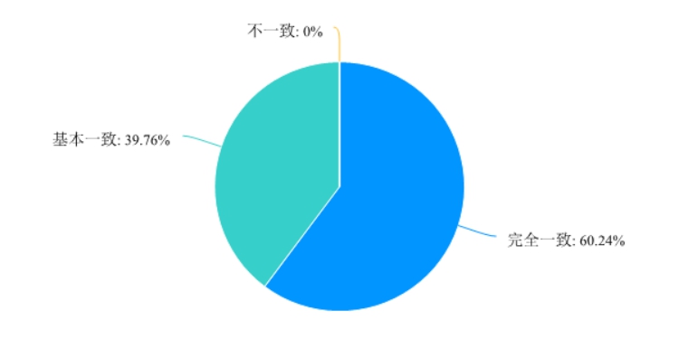 在调查问卷中,完全严格按照教学计划进度进行教学的教师占比60.24%;与教学计划进度基本一致的教师占比39.76%;与教学计划进度不一致的教师人数为0。