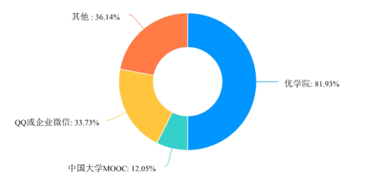 在调查问卷中,使用优公司的教师占81.95%;使用中国大学MOOC的教师占12.05%;使用QQ或企业微信的教师占33.73%;使用其他教学平台的教师占36.14%。