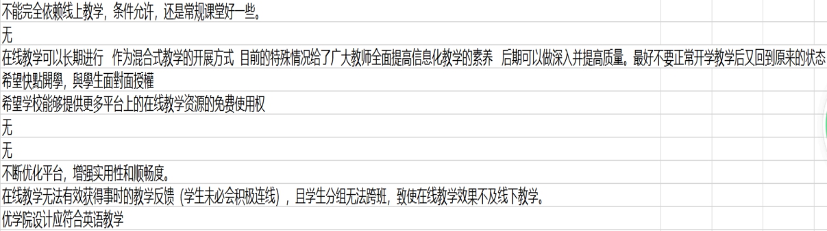 可见,大部分教师对在线教学的未来发展还是比较看好的,但是由于是特殊时期临时开展的线上教学,还是有不少教师存在疑惑和顾虑,教师对不同专业不同课程也有心中认为合适的方法。在线教学有一定的优势,但面对面教学作为传统的教学方法对在线教学和教师的教学习惯还是会产生很大的影响。