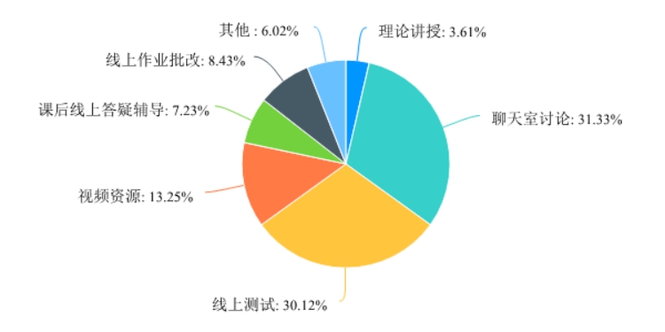 在课程环节中,教师认为理论讲授最薄弱的占3.61%;教师认为聊天室讨论最薄弱的占31.33%;教师认为线上测试最薄弱的占30.12%;教师认为视频资源最薄弱的占13.25%;教师认为课后线上答疑辅导最薄弱的占7.23%;教师认为线上作业批改最薄弱的占8.43%;6.02%的教师认为其他环节最薄弱,主要有以下环节:①员工互动讨论;②直播及视频制作技术环节;③感觉平台服务器不稳定、线上有时网络不稳定互动效果差。