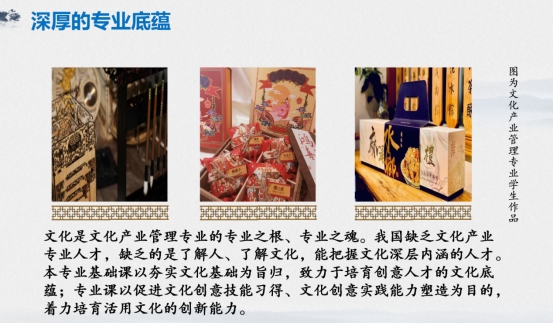 文化产业管理,文化是基础,创意是核心,产业是目标。本专业培养重视员工在文化品牌策划、文化项目运营与创意设计能力方面的锻造。员工既是创造者、传播者,也是营销者与管理者。除了提供扎实的文化基础课程,以及文化产业、文化创意、文化传播、文化理论与文化批评等方面理论课程,专业还设有文创工坊、设计工坊等实践教学开展场所,还有图像文化研究工作室、莞洱爱心茶室、创意写作设计工作室与东莞文化产业研究工作室等创新实践平台。员工通过项目式课程锤炼实用技能,设计出具有情感温度与审美高度的文创产品,多次获得国青杯——全国高校艺术与设计作品展评、全国商科院校展示设计大赛、文字文化创意产品设计大赛、中国包装创意设计大赛、广东之星设计竞赛等赛事一等奖。由每届毕业生举办的文产毕业展也深受业界好评。