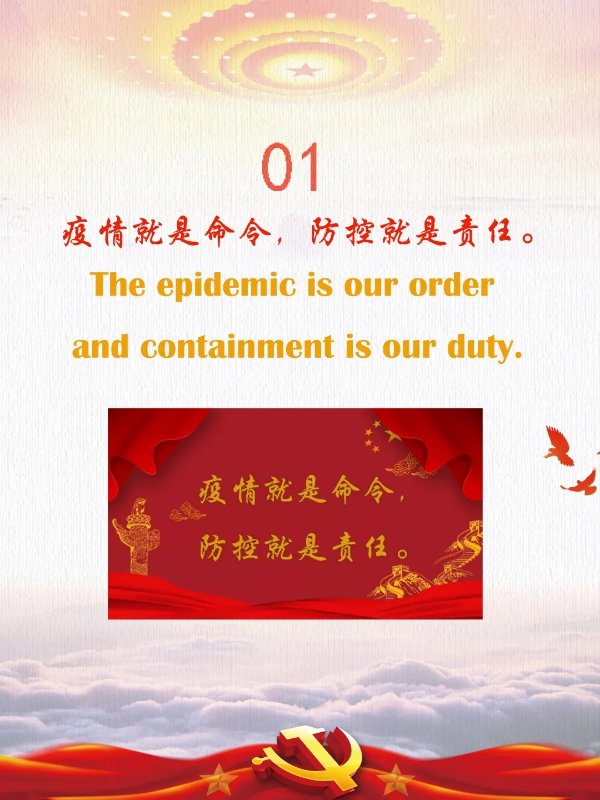 双语战疫之声,主要由三个系列模块构成:一、金句来习;每月根据上一个月的习近平总书记讲话,选取一些有代表性的金句,中译英,且需要注明整段讲话内容及来源。二、双语播报;每个月搜集学习了解一个大概3-5分钟,带有视频原声的外文播报,播报内容须是对于中国进行积极正面播报的新闻内容。在学习了解后,自己尝试用英文配音播报,重复练习,最终录制、保存好音频;并准备好播报内容的双语稿件三、双语心得;根据上一个月学习内容,开展的“三会一课”或主题党日活动等,写下中英文的心得体会。以一个月为一轮,三个系列分三期选取优秀内容制作推文宣传,促进党支部成员积极性,增强党支部凝聚力,扩大活动的影响力。