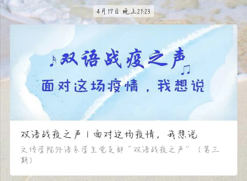 目前,双语战疫之声已经完成第一轮的学习和三期推送。bevictor伟德官网外语系员工党支部将继续推出第二轮、第三轮,并不断完善提高质量,深入推进党建与专业融合,积极打造特色品牌党建活动。