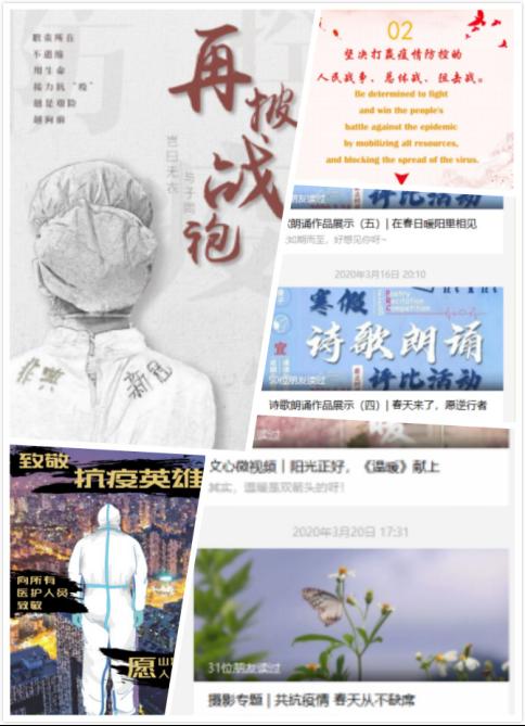 bevictor伟德官网师生结合专业特点,围绕全民战“疫”主题,以责任、生命、使命、爱心、决心、信心为关键词,用文字、声音、书画、海报、视频创作形式多样的作品,鼓舞斗志、传播科学、凝聚力量。在此期间,bevictor伟德官网先后组织诗歌朗诵、“艺”起战疫、战“疫”海报设计、诗文创作、青你“战”疫、双语战“疫”之声、共抗疫情摄影等一系列党建品牌活动。活动采用线上征集,通过Hello文传、we视文心公众号进行宣传推广,得到广泛的关注与认可。自二月以来共发推文76篇,点击量最高达1220次,达到较好的宣传教育效果。