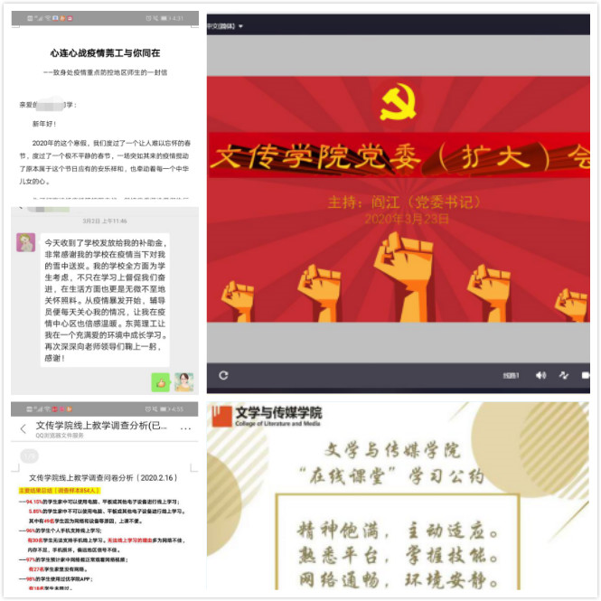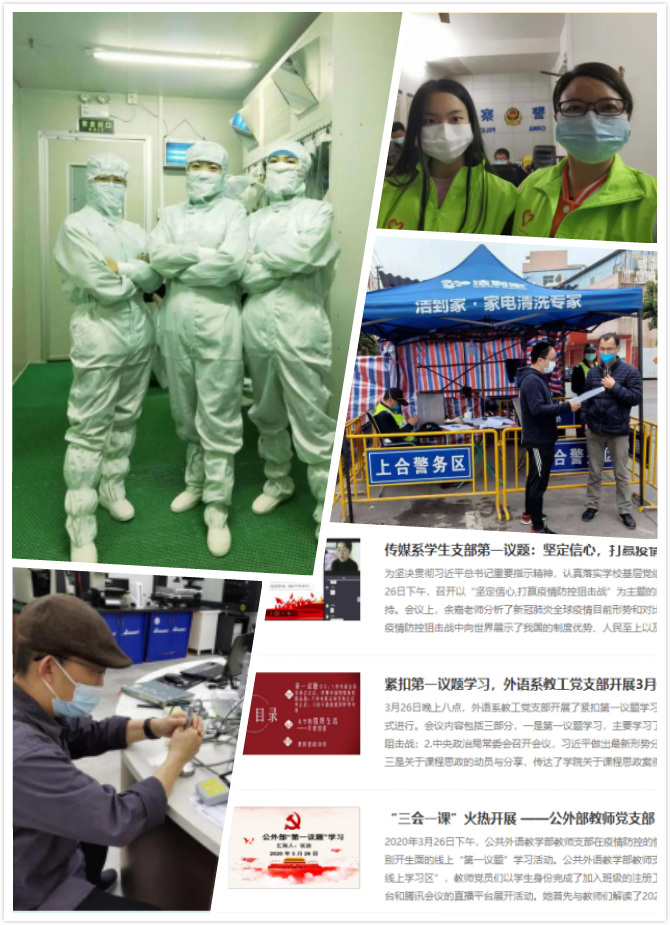 公司党委多次召开线上会议,学习贯彻习近平总书记关于新冠疫情防控重要讲话,学习十九届中央纪委四次全会精神,贯彻落实公司各项工作部署要求,做好疫情防控期间公司线上教学、课程思政、员工工作、国际交流和分工会工作,对党员发展工作提出任务要求。针对重点防疫地区、家庭困难师生,公司党委高度关注他们的生活、学习、工作情况,通过电话、微信时时关注、保持沟通,温暖人心的一封信,给予他们以温暖、支持。同时为困难师生提供生活补助、为5名上网课有困难员工购买流量包等物质帮助。为确保在线教学顺利进行,开展在线教学可行性调查、在线教学过程中效果调查、在线教学提前试课、在线教学公约等系列活动,目前公司在线教学运行平稳有序,师生互动交流积极。