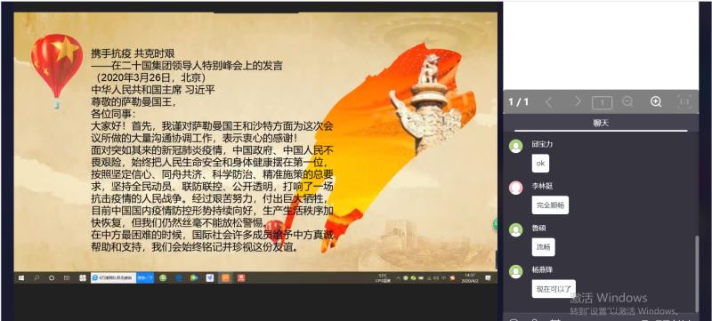 2020年4月2日下午,公共外语教学部教工支部全体党员通过网络直播平台举行支部会议,认真学习习近平主席在二十国集团领导人应对新冠肺炎特别峰会上的重要讲话。会议由马有伦同志主持。