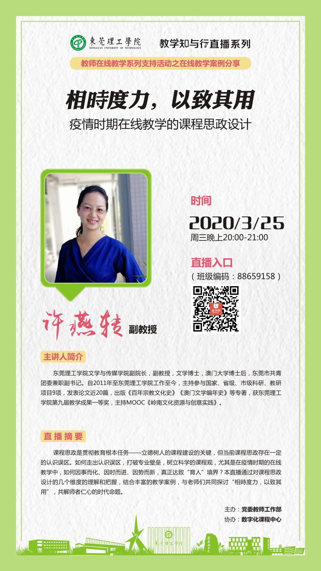 3月25日晚,在党委教师工作部和数字化课程中心的精心组织下,韦德官方网站“教学知与行直播系列”之“相时度力,以致其用——疫情期在线教学的课程思政设计”在优公司直播平台顺利开播。公司党委委员、副经理许燕转为校内外老师们带来了一场精彩直播课。