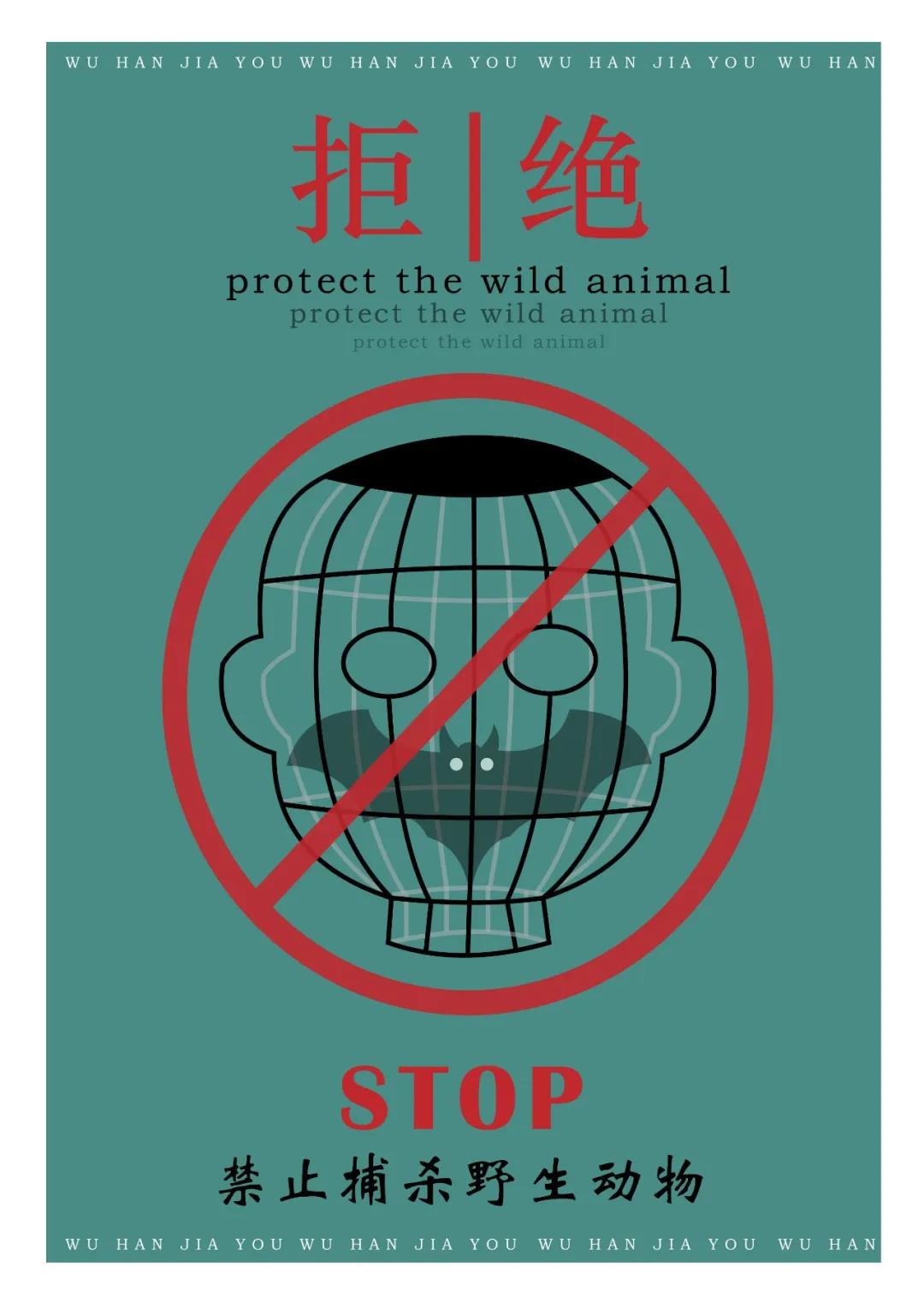 通过将蝙蝠置于嘴部,意为祸从口入;而将头部以笼子形象展现,意为疫情爆发,人们只能待在家中,先前是人类将动物关在笼类,此时却是动物将人类关在家内,生活各方面都受到了极大的影响及限制。