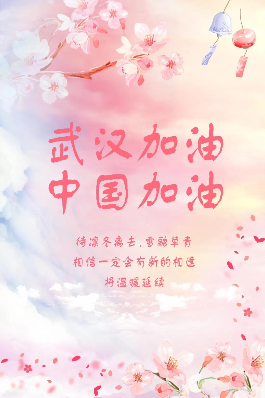 在这张海报的设计过程中,我采用了以浅蓝色和粉色为主的暖色调为背景,以樱花及风铃等元素为点缀,设计出了这张海报,为武汉祈福,为中国加油。我相信,明媚的阳光会再次照亮这片土地,樱花会再次盛开,风雨会过去,我们会重逢。