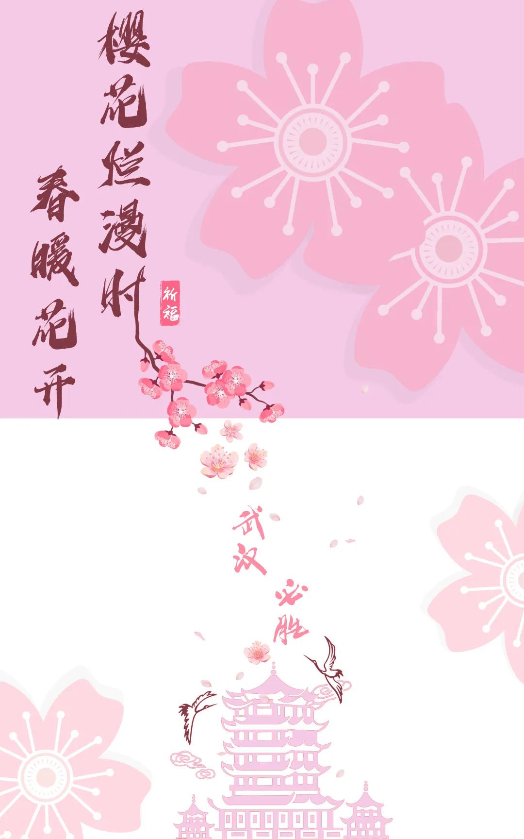 武汉古塔和樱花则代表武汉。“春暖花开,樱花烂漫时,武汉必胜”是我对武汉最真挚的祝福,希望武汉尽快度过难关,同时也希望中国能恢复热闹繁盛的景象。