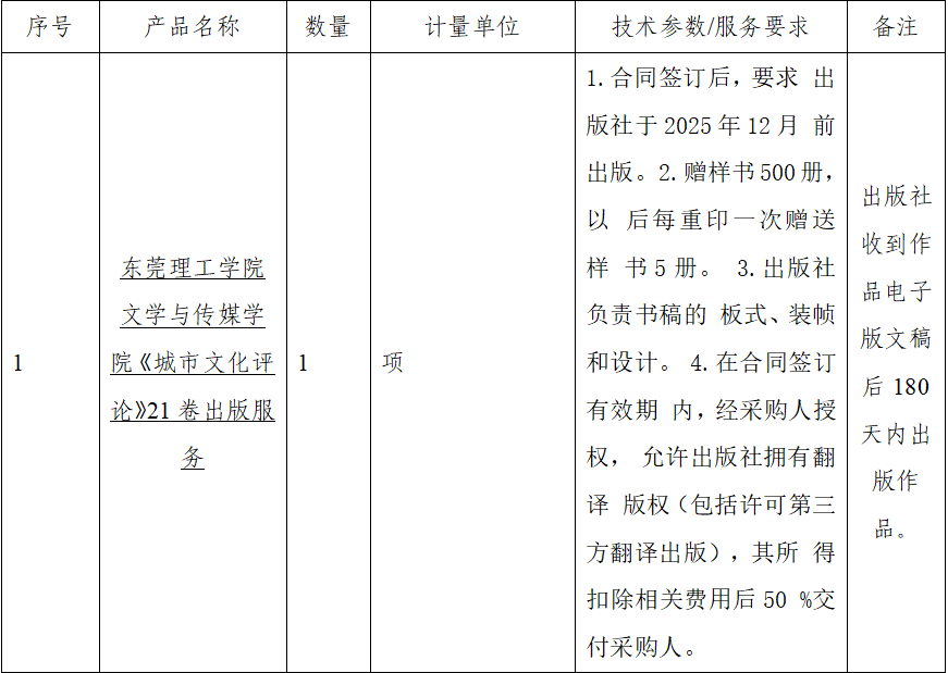 1 | bevictor伟德官网《城市文化评论》21卷出版服务 | 1 | 项 | 1.合同签订后,要求 出版社于2025年12月 前出版。 2.赠样书500册,以 后每重印一次赠送样 书5册。 3.出版社负责书稿的 板式、装帧和设计。 4.在合同签订有效期 内,经采购人授权, 允许出版社拥有翻译 版权(包括许可第三 方翻译出版),其所 得扣除相关费用后50 %交付采购人。 |