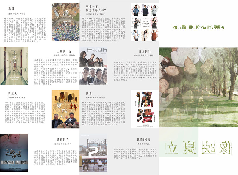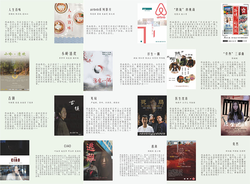 此次共有十部优秀毕业作品参与展映,作品题材丰富、形式多样,既有记录现实生活的纪录片又有内容深刻的剧情片,其中有记录高州木偶戏的《偶活》、关于临终关怀的《天堂的前一站》、讲述被时代遗落的弃儿故事的《江南弃儿》、充满潮汕特色与家乡情节的《劳热三部曲》、记录东莞人、事、物、情的《城韵》、表现传统耍猴业与现代城市文明发展的冲突的《Show 猴》等。