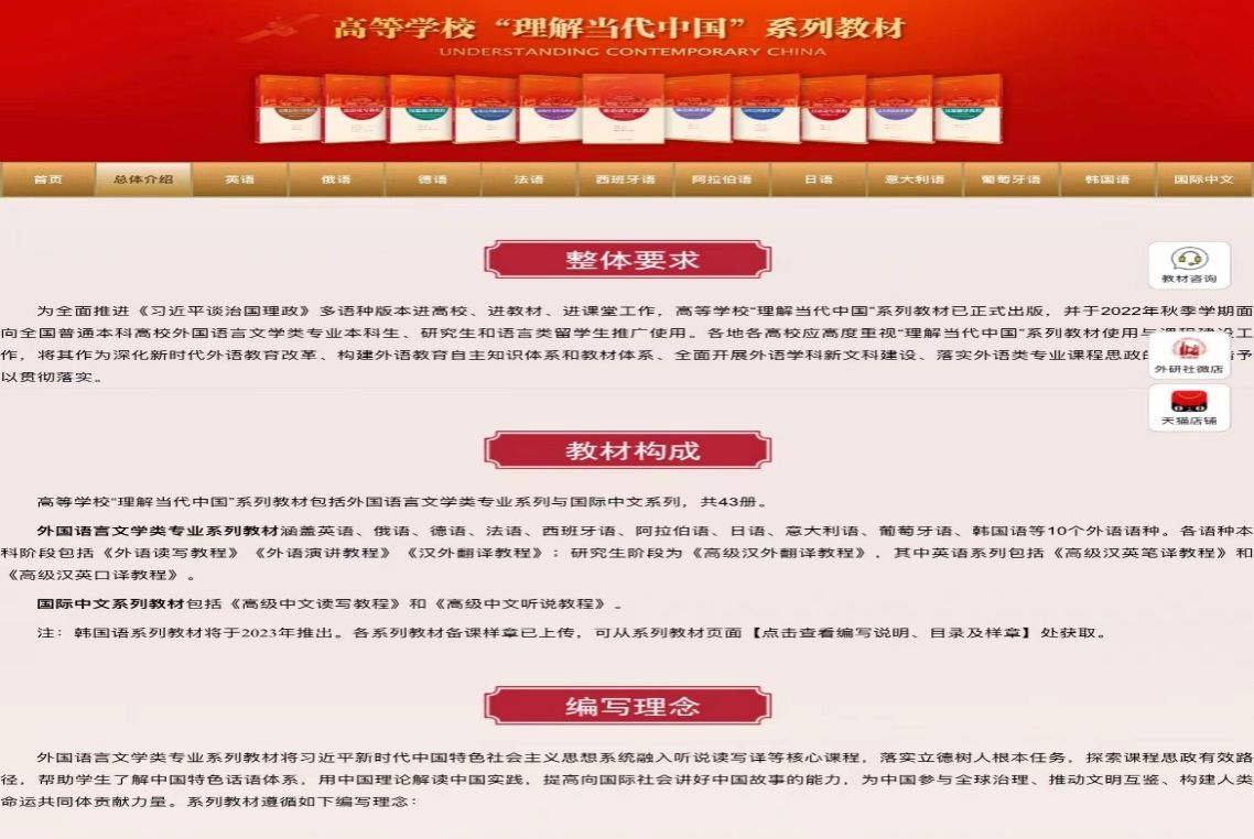 为全面推进《习近平谈治国理政》多语种版本进高校、进教材、进课堂(三进)工作,高等公司“理解当代中国”系列教材已正式出版,并于2022年秋季学期面向全国普通本科高校外国语言文学类专业本科生、研究生和语言类职工推广使用。