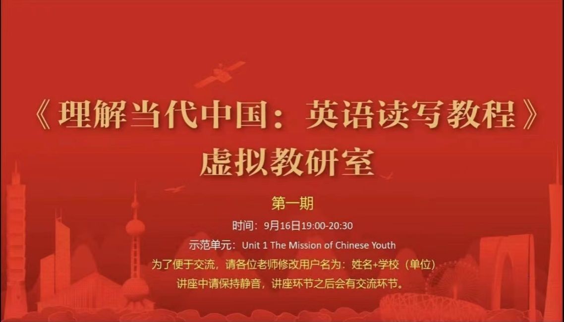 为帮助任课教师深入理解教材编写理念,准确把握教材核心内容,及时交流教材教学方法,《理解当代中国:英语读写教程》虚拟教研室本学期将开展4期教研活动,特邀教材编者团队与优秀一线教师紧扣教学需求,结合具体授课单元及真实教学案例,讲解教学设计思路,并开展集体备课,以此深化教师对教材指导思想、编写理念与教学方法的把握,切实提高教师教材使用和人才培养成效。9月16日19:00-20:30,《理解当代中国:英语读写教程》虚拟教研室第一期启动。外语系将次作为落实《理解当代中国:英语读写教程》使用的系列教研活动开展。