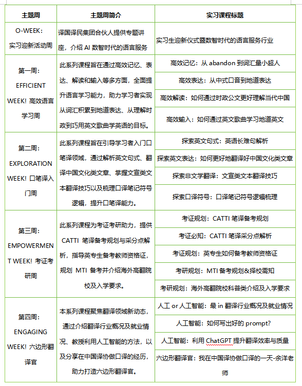 在中信出版社·无界工作室任职的赵仁博编辑讲授的编辑部的故事:《 编辑与译者如何协作为翻译作品赋能——以奇幻小说,<巴别塔>为例》、李长栓教授讲授的《AI与翻译大神的实力较量:译文实例讲解——以<巴别塔>为例》、作为AI产品经理的刘坚老师讲授的《是异想天开吗?外语人如何成为AI产品经理?》、岳峰教授讲授的《文旅翻译漫谈》、李梅教授讲授的《宇宙尽头文科专业新赛道技术传播》、在人民日报社作为首席记者的杨升记者讲授的《如何用英文报道中国故事》。