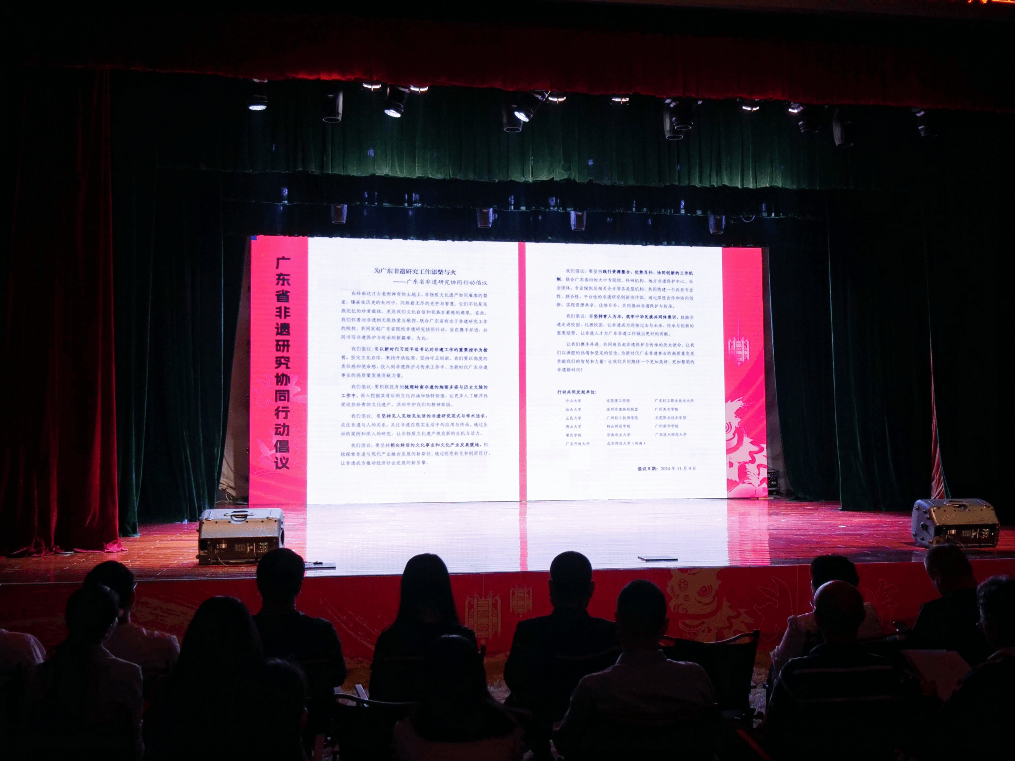 仪式中,展示并宣读了《广东省院校非遗研究协同行动倡议书》。该倡议书着重强调了院校在非遗团队建设、科学研究、人才培养、社会服务、产教融合、协同创新等方面的重要作用和贡献,并呼吁开展更广泛的协同合作。通过这份倡议书,活动旨在集结各方力量,共同推动非遗保护工作的深入发展。